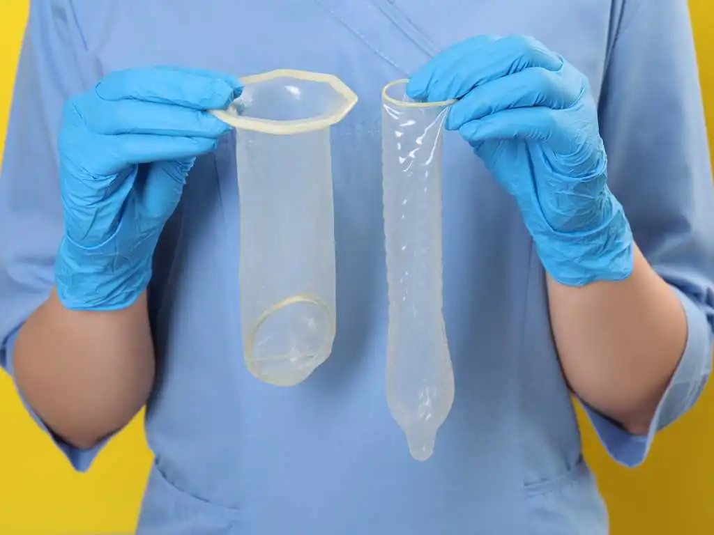 Female condoms consist of a pouch with an inner and an outer ring. The inner ring is inserted deep into the vagina, while the outer ring remains outside. The penis is then guided through the outer ring into the pouch. After intercourse, the outer ring of the female condom should be compressed and twisted to prevent semen from leaking out. The condom can then be carefully removed.